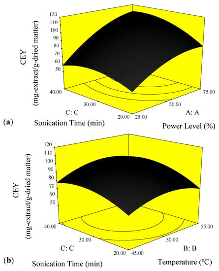 Figure 3 presents the three dimensional response surface plots which are highly recommended for the graphical interpretation of the interaction effect of process variables on the response [18]. Figure 3a illustrates the effect of power level and sonication time on the CEY at a constant temperature of 50 °C. At a fixed power level, the CEY increased when sonication time was extended to 35 min whereas it was diminished by 40 min of sonication time. It was reported that 40 min of sonication time was sufficient to complete the extraction process of epimedin C from fresh leaves of Epimedium [19] and anthocyanins from mulberry [20]. It is worthy of note that the ultrasound-assisted extraction mechanism consists of two main stages. First, “washing” which is dissolution of soluble compounds on surfaces of the plant matrix. Secondly, “slow extraction” which defined as mass transfer of the solute from the plant matrix into the solvent by diffusion and osmotic processes [21]. These two phenomena were clearly observed in Figure 3a,b. Washing is happening at the beginning of the extraction with a rapid increase. After that, the slow extraction is observed by a low raise in crude yield. Moreover, it was found out that increase of power level (X1) resulted in increase of CEY. Higher amplitude of ultrasound could have damaged more cell walls releasing more crude oil to the solvent [22]. This finding is in agreement with those obtained by Hossain et al. and Zou et al. [23,24].