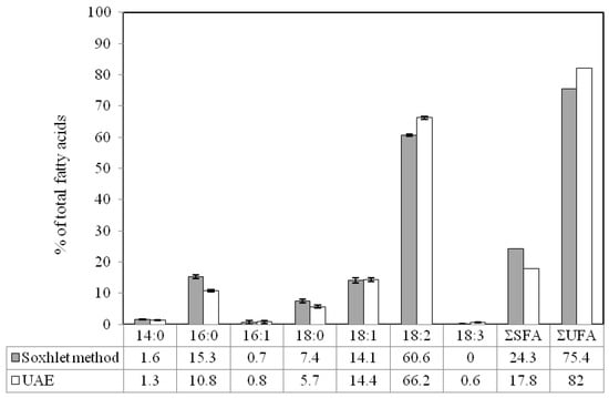 The fatty acid composition of extracts obtained using optimized ultrasound-assisted extraction and Soxhlet method is presented in Figure 5. It was observed that both of the extracts were very rich in unsaturated fatty acids (up to 82% for ultrasound-assisted extraction and 75% for Soxhlet method). The major unsaturated fatty acids which detected in extracts obtained using the Soxhlet method and UAE were linoleic acid (60.6 and 66.2% of total fatty acids, respectively) and oleic acid (14.1 and 14.4% of total fatty acids, respectively). α-Linolenic acid, which is a kind of omega-3 fatty acid, was detected in extract obtained by the optimized ultrasound-assisted extraction method. Omega-3 fatty acids have been introduced as effective dietary supplements for the management of different diseases by enhancing the mechanisms of antioxidant defense [28]. On the other hand, a relatively low content of saturated fatty acids (SFA) was detected in both extracts (Figure 4), but it should be mentioned that higher temperature seems to be more favorable for extraction of SFA [29].
