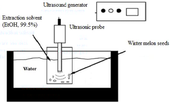 In present study, a 500 W ultrasound equipment (Sonics and Materials Inc., Model VC505, Danbury, CT, USA) with a titanium ultrasonic probe (13 mm diameter) was used for ultrasound-assisted extraction of crude oil from Benincasa hispida seeds. The nominal frequency was 20 kHz. Ground seed (about 5 g) was placed in a 100 mL beaker containing ethanol as a food grade solvent which is recommended by the US Food and Drug Administration for extraction purposes. The solid/solvent ratio was 1:10 (g/mL). The beaker placed in a temperature controlled water bath (Memmert WNE14. Memmert GmbH Co. KG, Schwabach, Germany). Extraction was carried out at temperatures ranging from 45 to 55 °C. Temperature was verified with a digital thermometer (Ellab CTD-85, Ellab, Hilleroed, Denmark) and a thermocouple (1.2 mm needle diameter constantan type T) and no significant increase in temperature (below 2 °C) was detected due to circulation of water in water bath during extraction. The applied power levels were adjusted to 25, 50 and 75% of the maximal equipment power (500 W), corresponding to 125, 250 and 375 W through the variation of amplitude of piezocrystals. The corresponding ultrasound intensities were 94, 189 and 284 W/cm2. The immersed samples in extraction solvent were subjected to ultrasonic waves for 20 to 40 min. The input range of the selected variables was determined by preliminary experiments. After extraction, the extracts were filtered through the Whatman No. 1. filter paper. Then, ethanol was removed from the extracts by evaporation under vacuum at 40 °C using a rotary evaporator (Eyela, A-1000S, Koishikawa Bunkyo-ku, Japan). Subsequently, the residual solvent was removed by drying in an oven at 40 °C for 1 hr and flushing with 99.9% nitrogen. The scheme of experimental set-up was presented in Figure 6.