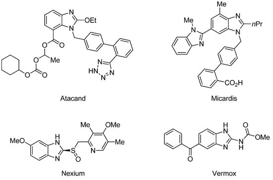 Benzimidazoles are an important class of heterocycles that are frequently used in drug and agrochemical discovery programs. For examples, the benzimidazole core structure is found in a variety of commercial drugs such as Atacand, Nexium, Micardis, Protonix, and Vermox (Figure 1). Recent medicinal chemistry applications of benzimidazole analogs include antibacterial and antifungal agents [1,2,3], anthelmintic agents [4], HIV-1-induced cytopathic inhibitor [5], anti-inflammatory and antiulcer agents [6], cytotoxic and antitumor agents [7,8], DNA binding agents [9], enzyme and receptor agonists or antagonists [10]. Other applications of benzimidazoles include their use as organic ligands [11,12], fluorescent whitening agent dyes [13] and functional materials [14,15]. Therefore, the construction of these heterocycles has always been of great interest to organic and medicinal chemists and has consequently received much attention [16].