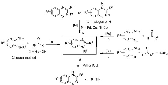 The classical and most common methods to assemble benzimidazoles involve the condensation of benzene-1,2-diamines with aldehydes, carboxylic acids, or their derivatives (Scheme 1, route a) under strong acid/high temperature conditions or using a stoichiometric oxidant [17,18,19,20]. Although these transformations are widely used owing to their inherent simplicity, this method is restricted to the available starting materials and involves harsh reaction conditions [17,18,19,20]. Furthermore, this methodology is not suitable for the regioselective synthesis of N-substituted benzimidazoles, as both syntheses result in regioisomers and disubstituted products from the 1,2-diaminoarene. To circumvent these restrictions, the transition-metal-catalyzed amination approach is a viable strategy to construct the benzimidazole ring regiospecifically. Among the different catalysts, palladium- [21,22,23,24,25], copper- [26,27,28,29,30,31,32,33], nickel- [34], iron- [35], and cobalt-based [36] complexes are generally employed for this coupling reaction (Scheme 1, routes b–e). Despite these recent advances, transition-metal-catalyzed methods are often expensive and require especially designed ligands. Another disadvantage is the need to find ways to remove metal-related impurities from products, an important issue in the synthesis of pharmaceutical compounds.