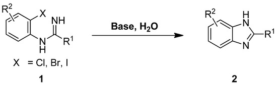 As shown in Scheme 2, we propose the synthesis of benzimidazole derivatives 2 through a direct base-mediated intramolecular N-arylation reaction in water, starting from the corresponding N-(2-haloaryl) amidine 1.