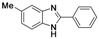 5-Methyl-2-phenyl-1H-benzo[d]imidazole (2e). White solid; m.p. 242–243 °C; yield: 67%. 1H-NMR: δ 12.80 (br s, 0.22H), 8.20 (m, 2H), 7.55 (m, 5H), 7.05 (m, 1H), 2.45 (s, 3H). 13C-NMR: δ 150.80, 141.94, 135.08, 131.53, 130.24, 129.59, 128.84, 128.01, 126.26, 123.51, 118.29, 110.86, 21.27. HRMS-ESI (m/z): [M+Na]+ calcd. for C14H12N2Na 231.0898; found 231.0896.