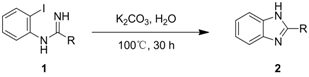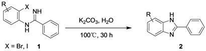 Optimization of other reaction conditions such as base, temperature and time is shown in Table 1. At first, the control experiment of 1a was examined in the absence of a base (entry 1, Table 1), and the desired product was not observed. The intramolecular carbon-nitrogen cross-coupling reaction of N-(2-iodophenyl)benzamidine (1a) using potassium carbonate (K2CO3, 2.0 equiv.) as the base in water at 100 °C for 30 h was then examined. To our delight, benzimidazole 2a was smoothly obtained in 80% yield (entry 2, Table 1).