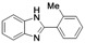 2-o-Tolyl-1H-benzo[d]imidazole (2k). White solid; m.p. 206–208 °C; yield: 58%. 1H-NMR δ 12.64 (br s, 0.11H), 7.76–7.74 (d, 1H, J = 6.8 Hz), 7.62 (m, 2H), 7.39–7.37 (m, 3H), 7.23–7.21 (m, 2H), 2.62 (s, 3H). 13C-NMR δ 151.73, 136.91, 131.15, 129.94, 129.33, 129.22, 125.85, 121.78, 20.90. HRMS-ESI (m/z): [M+Na]+ calcd. for C14H12N2Na 231.0898; found 231.0901.