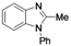 2-Methyl-1-phenyl-1H-benzo[d]imidazole (2u). White solid; m.p. 127–129 °C; yield: 33%. 1H-NMR: δ 7.67–7.63 (m, 3H), 7.59–7.53 (m, 3H), 7.24–7.12 (m, 3H), 2.43 (s, 3H). 13C-NMR δ 143.2, 136.1, 134.3, 130.4, 129.2, 127.3, 124.5, 122.8, 122.4, 118.9, 110.3, 14.6. HRMS-ESI (m/z): [M+Na]+ calcd. for C14H12N2Na 231.0898; found 231.0896.