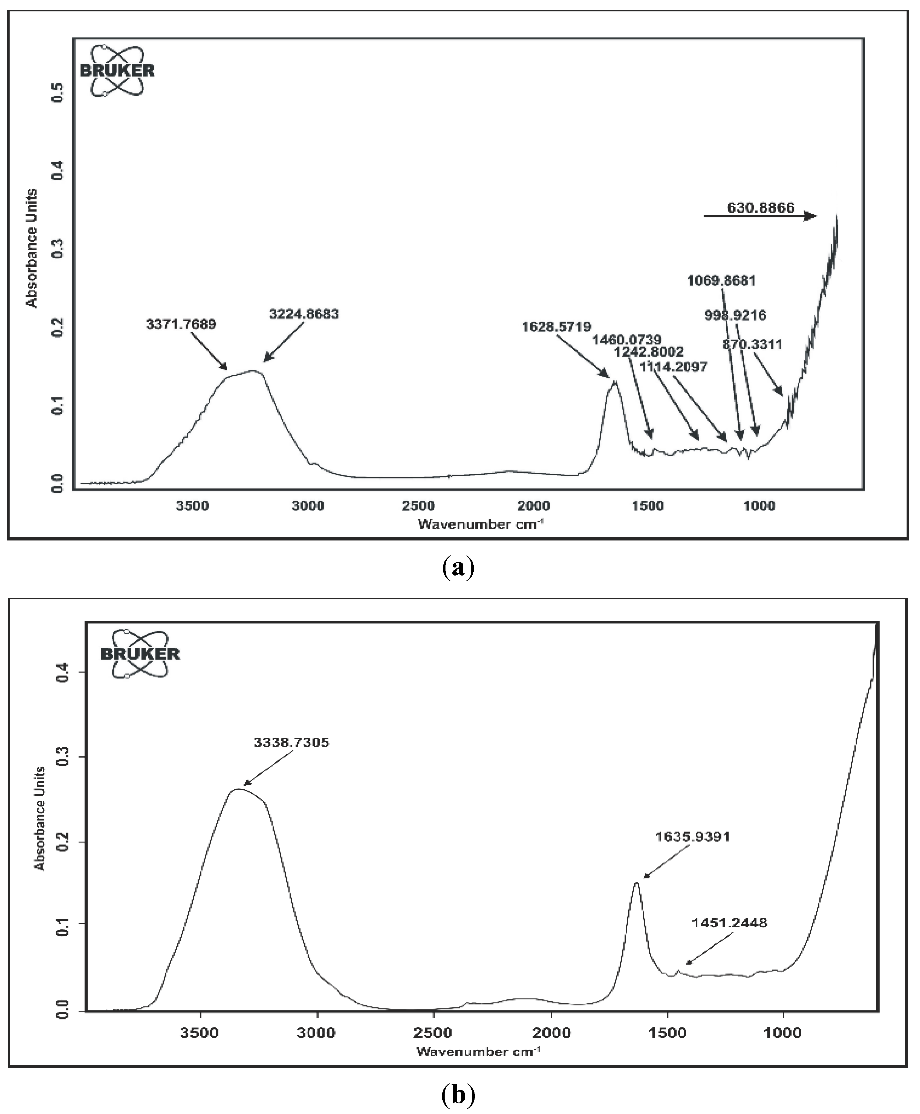 It is evident from the FTIR spectrum of the superabsorbent hydrogel that two N-H stretching bands appear at 3224.8683 and 3371.7689 cm−1, respectively. The C=O stretching is also observed at 1628.5719 cm−1. The peak at 1460.0739 cm−1 is the C-N stretching band and 1114.2097 cm−1 is another peak related to the amide group. The peak appearing at 1242.8002 cm−1 is the characteristic (C-O) stretching peak of -COOH (Figure 4a).