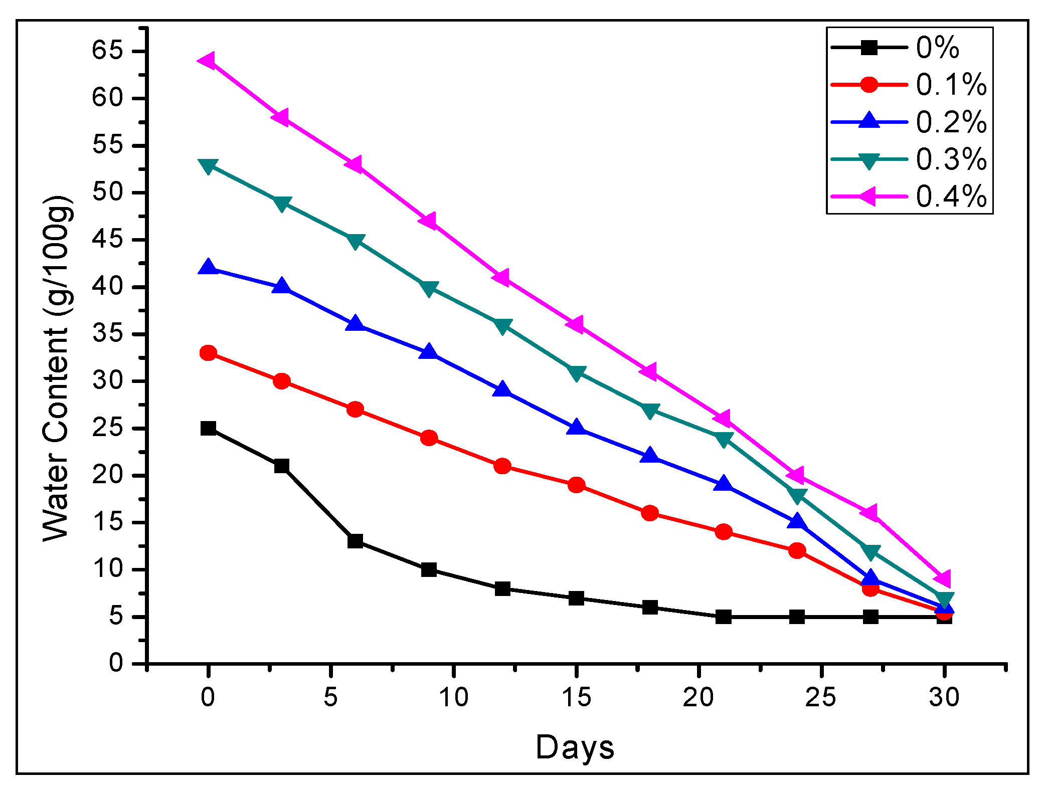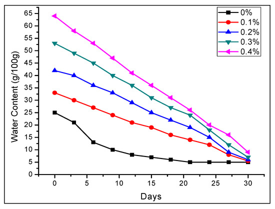 The sandy loam soil amended with 0.1 to 0.4% of PHNC possessed a good capacity for water retention at field capacity (0.03 MPa pressure) even four weeks after initial watering (Figure 5) [2,6,8]. This remarkable increase in soil water retention might be attributed to the hydrophilic polymer network and introduction of adequate amount of potassium humate in the superabsorbent hydrogel polymeric network which enhanced hydrophilicity of PHNC. However, a gradual decrease in water contents of soil amended with 0.1 to 0.4 w/w% PHNC was observed which finally approached 5 to 8 g/100 g after 30 days. This gradual decrease in water contents can be linked to the water uptake by the plants and some transpiration. The previous studies reported in the literature verify this phenomenon [2,22,23].