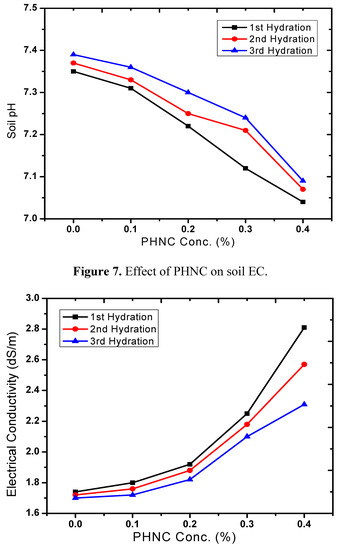 In the present study the effect of PHNC on different attributes of soil water retention of sandy loam soil amended with different concentrations (0.1, 0.2, 0.3 and 0.4 w/w%) of PHNC was estimated at field capacity (0.03 MPa pressure). The results obtained (Figure 6, Figure 7, Figure 8, Figure 9, Figure 10) reveal that the applied PHNC had a positive effect towards improving the soil characteristics, i.e., the values of bulk density and hydraulic conductivity were decreased, whereas total porosity and moisture retention at field capacity were increased with increasing the concentration of PHNC in sandy loam soil. In comparison to our previous study on sandy loam soil amended with SHNC (when moisture was retained for three weeks only) [30], the same soil amended with the newly developed PHNC retained the moisture for more than four weeks. This increase may be attributed to the increase of storage pores in the sandy loam soil which can be regarded as an index of an improved soil structure. The pronounced decrease in hydraulic conductivity of the sandy loam soil may be attributed to the creation of micropores, and the dominance of meso- and micropores. These results are in agreement with those of El-Fayoumy and Ramadan [31] who applied organic soil conditioners surpassed K-humate for improving the soil hydrophysical properties. This was true, since the active -OH and -COOH represent pronounced values and had a profound effect on soil structure as reported by Moustafa et al. [32].