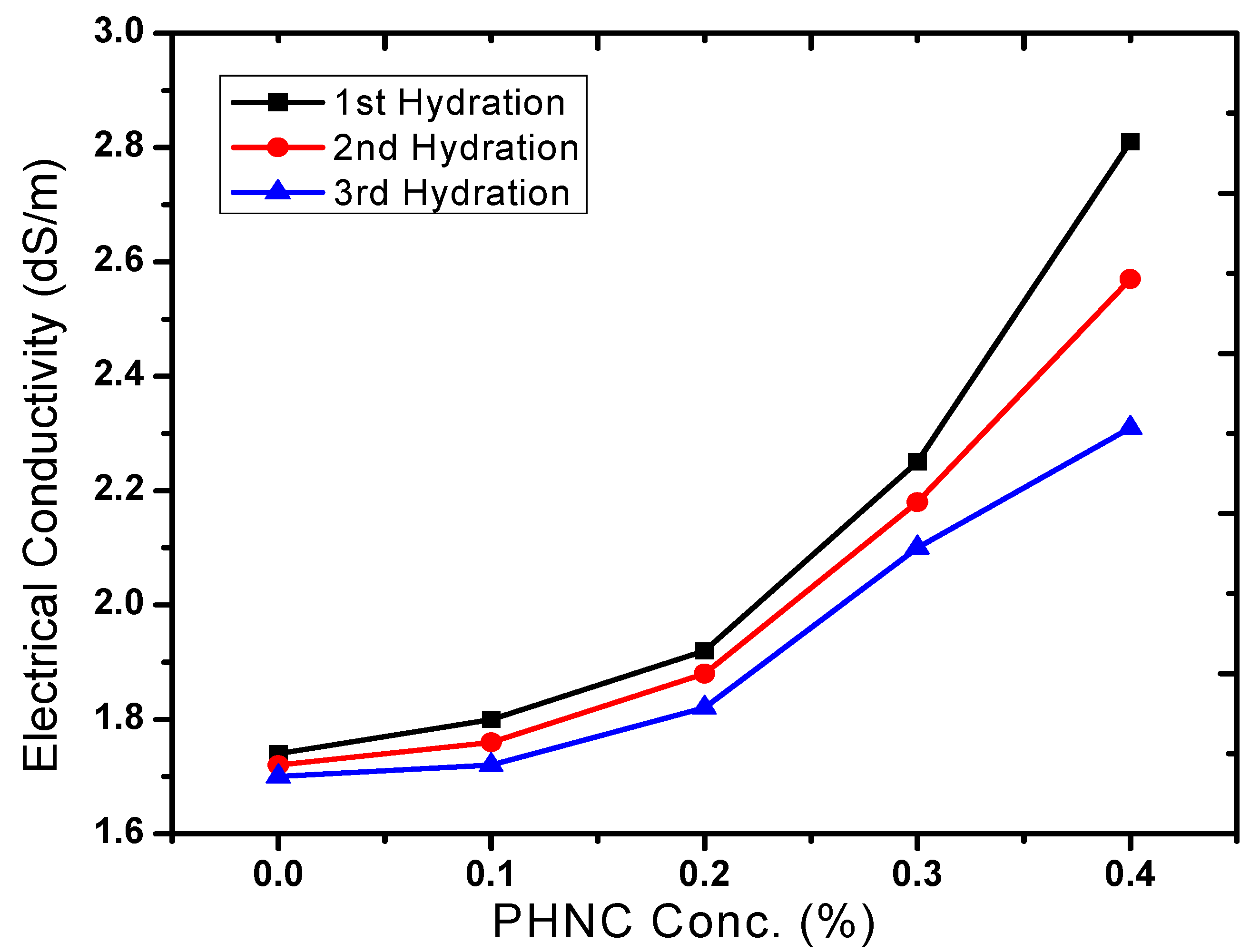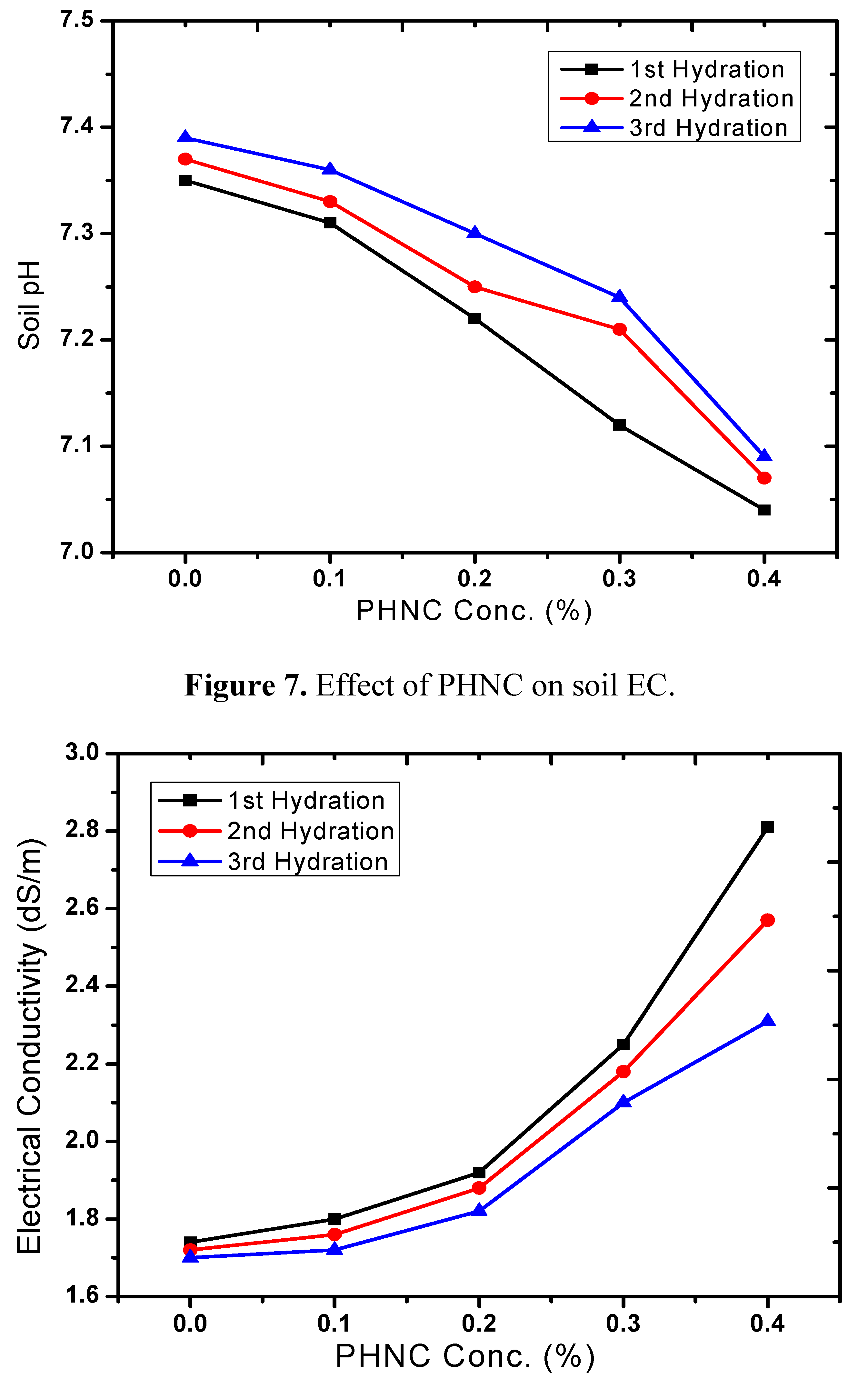 The pH and EC are important factors of the soil chemical, physical and biological properties [23]. The pH and EC varied with the application of PHNC (Figure 6 and Figure 7). Soil pH was reduced by 2 to 5% at concentration of 0.1 to 0.4%, compared with the control. Meanwhile, the electrical conductivity (EC) of PHNC amended soil increased about 6 to 57% (after 1st, 2nd and 3rd hydration) as compared to the control at concentrations 0.1 to 0.4%. The decrease in pH of the soil might have enhanced the discharge of soil inorganic salts thereby increasing EC of the soil. Similar effect on the pH and EC of soils due to the chemical structure of the superabsorbent polymer and soil characteristics has previously been appraised by Liu et al. [19] and Bai et al. [24], while studying the characteristics of chitosan-graft-poly (acrylic acid)/sodium humate superabsorbent.