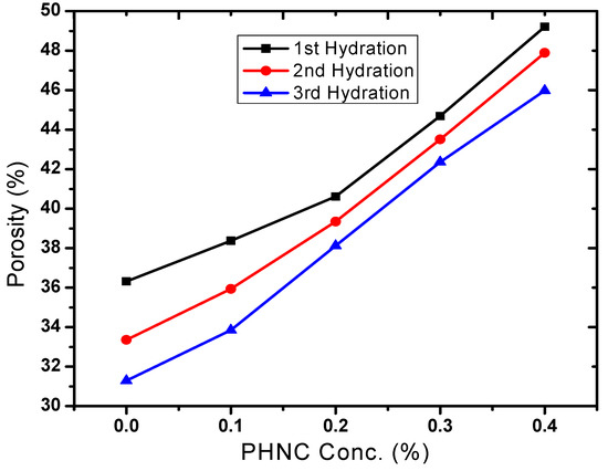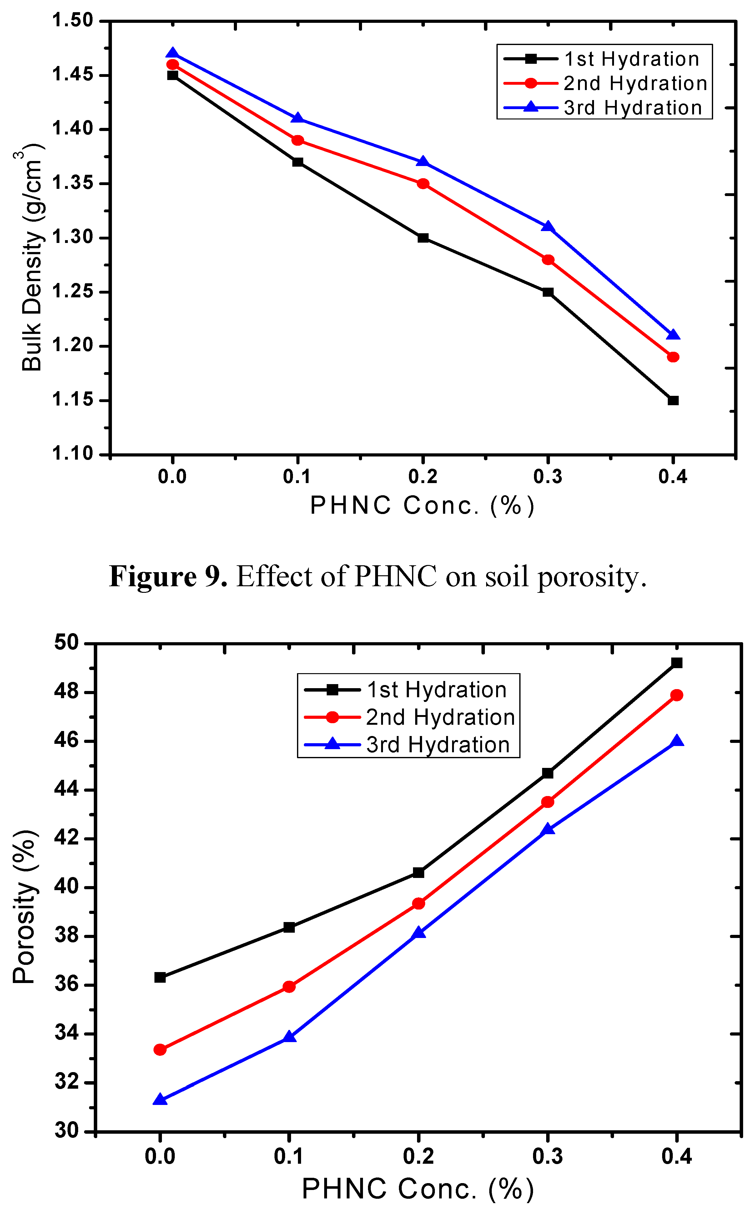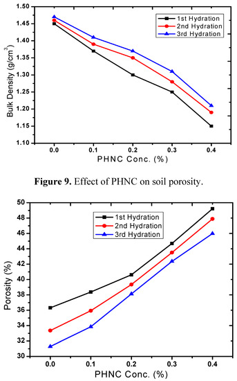 Bulk density has relationship with other properties of the soil such as porosity, moisture, and hydraulic conductivity. The maintenance of adequate bulk density is an important objective in agriculture. The soil bulk density varied with soil moisture (Figure 8) and decreased by 9 to 22% (after 1st, 2nd and 3rd hydration) at PHNC concentrations 0.1 to 0.4 w/w%, respectively, probably due to the swelling of soil with the incorporated superabsorbent polymer embedded with potassium humate. The decrease in soil bulk density to different extent is in agreement with the studies appraised by Liu et al. [19]. The soil porosity increased by 9 to 36% (Figure 9) at hydrogel concentrations 0.1% to 0.4 w/w%.