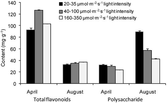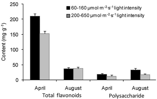 2.1. Seasonal Variations of Flavonoids and Polysaccharides under Different Light Intensities