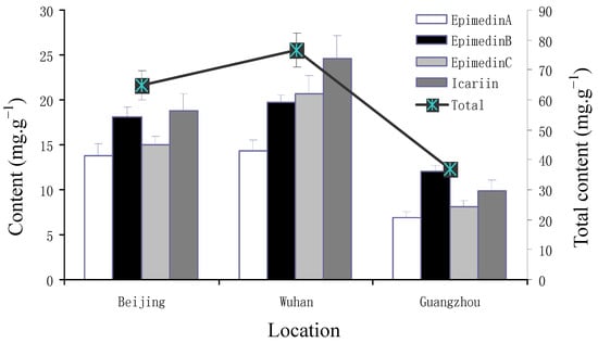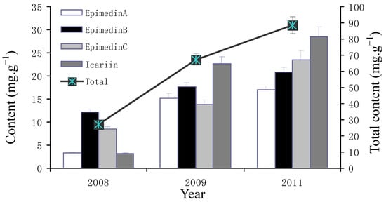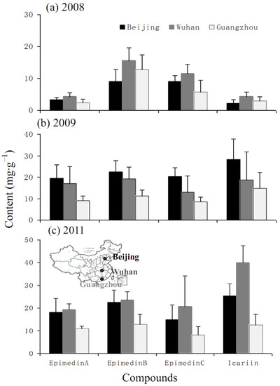 2.2. Yearly and Regional Variation of Content of Icariin, Epimedin A, B and C