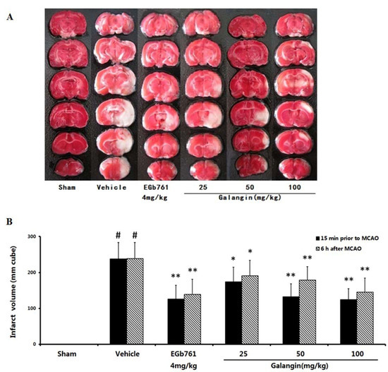 Middle cerebral artery occlusion was performed on the left side, and 24 h later, right hind paresis was observed in rats compared to the contralateral side, as shown in Figure 1. At PM and AM, the mean neurological score in the vehicle-treated group (2.87 ± 0.62) were significantly (p < 0.05) higher than the sham groups, indicating a neurological defect after the MCAO. In the EGb761 treated groups and the galangin- (50 mg·kg−1, 100 mg·kg−1) treated groups, the neurological deficits significantly improved (p < 0.05 or p < 0.01) compared to the vehicle-treated group. However, in the galangin-treated (25 mg·kg−1) group, no improvement of neurological defect was observed compared to the vehicle-treated MCAO group.