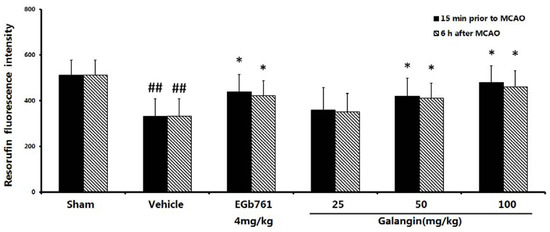 Mitochondrial function was evaluated by measuring the fluorescence intensity of resorufin. As shown in Figure 4, at PM, the mitochondrial viability was significantly changed in the vehicle-treated group. This value decreased from 511.83 ± 65.72 to 332.26 ± 77.73 as a result of the MCAO (p < 0.01). With the exception of the low-dose group of galangin, the galangin-treated groups at doses of 50 mg·kg−1 and 100 mg·kg−1 and the EGb761-treated group at a dose of 4 mg·kg−1 improved the mitochondrial function to a higher level (p < 0.05) compared to the vehicle control. At AM, the vehicle-treated group had significantly decreased mitochondrial function (p < 0.01) compared to the sham-treated group. The galangin-treated group at a dose of 50 mg·kg−1 and 100 mg·kg−1 and the EGb761-treated group at a dose of 4 mg·kg−1 improved the mitochondrial function to a higher level (p < 0.05). However, there was no significant improvement in the galangin-treated group at doses of 25 mg·kg−1.