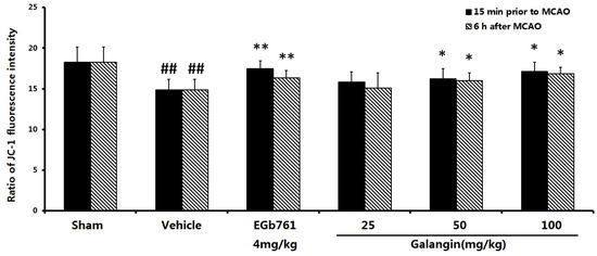 Effects of galangin on the mitochondrial membrane potential caused by MCAO. EGb761 and galangin were both administered by i.g. 15 min prior to MCAO and 6 h after MCAO. The values were expressed as the mean ± SD (n = 10), and the data were analyzed by one-way ANOVA. ## p < 0.01, # p < 0.05 versus the sham group; ** p < 0.01, * p < 0.05 versus the vehicle control.