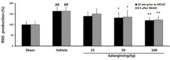 Mitochondria are postulated to be the major source of ROS production in cells. The results of ROS generation were shown in Figure 8. Cerebral ischemia induces an increase in the production of ROS. At PM and AM, the DCF fluorescence in the MCAO rat brain mitochondria was significantly higher than the sham group (p < 0.01). Treatment with galangin (50 and 100 mg·kg−1) significantly decreased the DCF fluorescence (p < 0.05 or p < 0.01). This showed that galangin can markedly reduce ROS production in a dose-dependent manner.