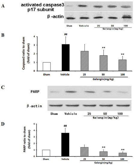 Caspase-3 is an important executioner in apoptosis because it hydrolyzes a number of structural and signaling proteins involved in apoptosis, including the DNA repair enzyme, PARP. As illustrated in Figure 10B, Western blot analysis showed that the level of activated caspase-3 increased significantly after MCAO. As a result, the cleavage of PARP, an intrinsic substrate of caspase-3, also increased significantly. However, the increased activation of caspase-3 and cleavage of PARP were reduced in the galangin- (50 and 100 mg·kg−1) treated groups when administrated 6 h after the MCAO. The action of galangin with respect to these molecular events was most likely paralleled with its effects on apoptosis [15].