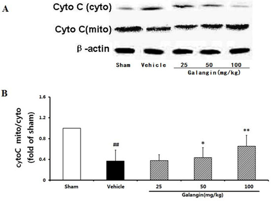 One of the mechanisms by which Bcl-2 blocks apoptosis is to decrease cytochrome c release from the mitochondria. As shown in Figure 11A, the significant translocation of cytochrome c had been detected in the vehicle control, in which the ratio of cytochrome c content in the mitochondrial and cytosolic fractions was approximately 0.37-fold of the sham group (p < 0.01) at 24 h after MCAO. Galangin treatment markedly increased the ratio (p < 0.01) (Figure 11B) when administrated 6 h after the MCAO. These results suggested that galangin could significantly inhibit the release of cytochrome c.