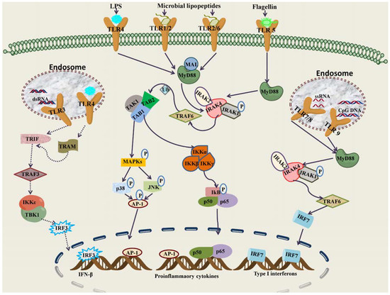 All TLRs, including TLR7, TLR8, and TLR9 depend on the MyD88-dependent pathway with the exception of TLR3, which exclusively uses the TRIF-dependent pathway to induce expression of proinflammatory cytokines [26]. Most TLRs activate the canonical signaling pathway through MyD88 [27], which in turn recruits and interacts with IL-1R-associated kinase-4 (IRAK4) [28]. IRAK4 phosphorylates IRAK1 and IRAK2 [29]; they in turn activate TNF receptor-associated factor 6 (TRAF6), which activates MAPKKK member TGF-β activated kinase 1 (TAK1) associated with TAK1-binding proteins 1 (TAB1) and TAB2. TAK1 phosphorylates and activates the inhibitor of kappa light polypeptide gene enhancer in B-cells kinase (IKK) complex, which in turn phosphorylates IκBs, resulting in their degradation and supporting the release and translocation of NF-κBs to the nucleus. Ultimately, NF-κB activation induces transcription of proinflammatory cytokines such as TNF-α, IL-6, IL-1, and IL-12, key mediators of the inflammatory response [30,31,32]. Unlike other TLRs, TLR3 can signal independently of MyD88 by associating with the adaptor protein TRIF [33]. TRIF associates with TRAF3, TRAF6, receptor interacting protein 1 (RIP1), and RIP3. The association of TRAF6 and RIP1 leads to activation of NF-κBs and MAPKs to induce proinflammatory cytokines. TRAF3 activation initiates the phosphorylation and activation of IRF3, leading to IFN-β production [34,35]. TLR4 signals through the same TRIF pathway; however, under most circumstances, it also requires the adaptor TRAM protein. TLR stimulation leads to the activation of other signaling pathways such as p38, JNKs, ERKs, IRFs (IRF3, IRF5, and IRF7), and MAPKs [36]. These pathways are essential for the orchestration of innate and adaptive immune responses and tissue repair in the host (Figure 1).