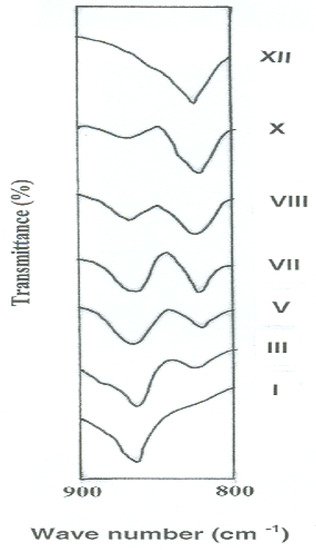 Specific assignment of the band due to -N=N- stretching was not possible because of the overlap by the band corresponding to C=C stretching in aromatic rings [35,36]. Further, it would be expected that all of these polymers have the same structural formula except for the mode of linking of phenylene rings in the polymer chains. This expectation was evidenced experimentally by comparing the FTIR spectra of the polymers in the region of 900–800 cm−1 which is characteristic for aromatic C-H out-of-plane bending vibration. In this experiment, thin polymer films having similar thickness of 3 μm were tested in order to obtain a fair detection of any change in the spectra. Figure 1 illustrates the variations of the intensities of FTIR peaks of these polymers in the aforementioned region as a function of their meta- to para-phenylene moieties content. It can be noted that the meta- to para-phenylene unit compositions of the polymers changed quantitatively in proportion to their compositions in feed. FTIR spectra showed a gradual increase in the intensity of the band corresponding to the meta-phenylene moiety (at 825 cm−1), together with a reduction of that of the para-phenylene ring (at 865 cm−1) from polymer I to XII.