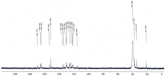 The molecular structures of the evaluated polymers were also confirmed by NMR analysis. The 1H-NMR and 13C-NMR spectra of polymer XII (Figure 2), as an example, are shown in Figure 3 and Figure 4, respectively. In the 1H-NMR spectrum (200 MHz, DMSO-d6), the polymer showed the following characteristic peaks: δ = 10.73 (s, 1H, OH, D2O exchangeable), 10.47 (s, 1H, NHb, D2O exchangeable), 10.01 (s, 1H, NHa, D2O exchangeable), 7.08–8.59 ppm (m, 13H, 12 Ar. H+NHc). In the 13C-NMR (300 MHz, DMSO-d6) spectrum, the characteristic resonances of the carbon atoms are as follows: δ = 169.4 (C1=O), 164.9 (C8=O), 153.5 (C6), 151.5 (C12), 135.4 (C2), 133.8 (C3), 130.4 (C4), 129.6 (C13), 125.1 (C9), 123.0 (C5), 121.6 (C10), 121.1 (C7), 115.1 (C14), 113.0 ppm (C11).