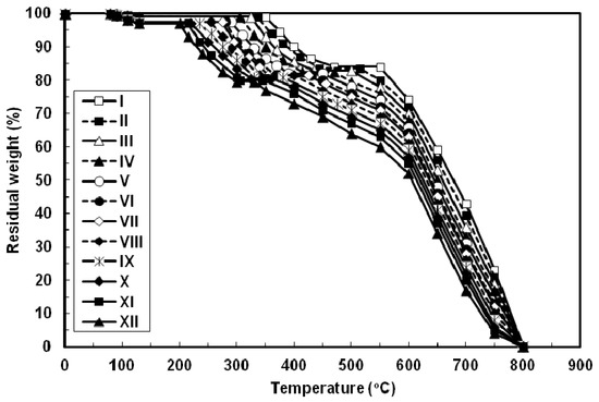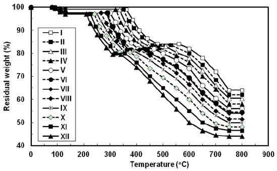 The thermal properties of all the azopoly(amide-hydrazide)s were evaluated by thermogravimetry (TG) in nitrogen and in air atmospheres at a heating rate of 10 °C min−1 and the typical TG curves thus obtained are shown in Figure 6 and Figure 7, respectively. In both degradation atmospheres, all the polymers showed characteristic similar thermal behavior and their weight losses could be observed in three distinctive steps. First, a small weight loss in the range of 1–3 wt% (based on the original polymer weight) occurred starting at 80 °C up to 130 °C, which may be attributed to loss of absorbed moisture. Second, a considerable weight loss (15–17.5 wt%, based on the weight of the perfectly dried polymer) was observed at various temperature ranges for different polymers in nitrogen and in air atmospheres. This weight loss is attributed to loss of water during the thermally induced conversion of the hydrazide and o-hydroxybenzamide groups to 1,3,4-oxadiazole and benzoxazole rings, respectively [12,23,40]. Along with this cyclodehydration reaction, the polymers may lose the azo group as molecular nitrogen [41,42]. Third, a sharp weight loss was obtained which indicated the decomposition of the poly(1,3,4-oxadiazolyl-benzoxazole)s which were formed in situ. The almost identical nature of the curves in both atmospheres indicates that the decompositions occur by the same mechanism. The improved resistance to high temperature was always associated with increased para-phenylene rings content of the evaluated polymers. In both degradation atmospheres and at all applied temperatures, polymer I showed the highest thermal stability as judged by its highest initial decomposition temperatures as well as its highest residual weight at a particular temperature, whereas the reverse was true for polymer XII. The other polymers of this series aligned themselves in between these two extreme cases so that with respect to their weight remaining at any particular temperature their order of stability was: I > II > III > IV > V > VI > VII > VIII > IX > X > XI > XII. Thus, substitution of para-phenylene nuclei for meta-phenylene improved the thermal stability of the polymer. This should also be associated with regularity of supermolecular packing within the bulk of the evaluated polymers wherein the collinear arrangement of the para-phenylene units should allow for establishment of stronger intermolecular hydrogen bonds which would be more difficult to break and therefore more resistance to elevated temperature. The resulting poly(1,3,4-oxadiazolyl-benzoxazole)s start to degrade in the temperature range above 340–560 °C in nitrogen and 330–550 °C in air without weight loss at a lower temperature. The percentage residues of poly(1,3,4-oxadiazolyl-benzoxazole)s at 750 °C in nitrogen were 64.5–80% of their original weights. On the other hand, smaller residues of 24.5–39% were observed at the same temperature in air. This indicates that the degradation rate of poly(1,3,4-oxadiazolyl-benzoxazole)s in air is faster than in nitrogen supported by the residual weight of the polymer at 750 °C as well as at particular temperatures. These observations confirm that azopoly(amide-hydrazide)s can be used as precursor polymers for the preparation of thermally stable poly(1,3,4-oxadiazolyl-benzoxazole)s. The detailed thermal and thermo-oxidative characterization of these polymers is in progress.
