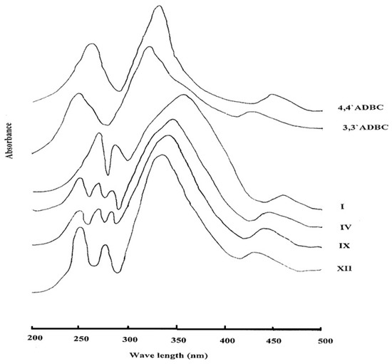 All the azopolyamide-hydrazides display orange colorations of varying intensity owing to the presence of the azo groups. The ultraviolet-visible absorption spectra of selected examples of azopolyamide-hydrazides I, IV, IX, and XII, which were measured in NMP solution (3 × 10−4 g/mL) are shown in Figure 8. It was found that the shape of the absorptions of all the investigated polymers was almost the same. The spectra showed a broad and intensive absorption between 300 and 400 nm corresponding to the π-π* transition of the trans form of the azo group present in the polymer main chain. A weak and broad absorption between 400 and 500 nm due to the n-π* electronic transition of the cis form of the azo group was also observed. The spectra showed absorption maxima at 355 and 460 nm for polymer I, at 345 and 445 nm for polymer IV, at 340 and 440 nm for polymer IX and 335 and 430 nm for polymer XII. It can be noted that the absorption maxima of the polymers were shifted toward a longer wave length with increasing their para-oriented phenylene units content. This may be attributed to extension of the conjugation through the azo group in the all-para-linked polymer relative to the other polymers. Moreover, all azopolyamide-hydrazides exhibited some peaks in the ultraviolet region which are the benzenoid bands for the various types of benzene rings derived from either 4A3HBH (at 284 ± 1 nm) or 3A4HBH (at 278 ± 2 nm) and 4,4′ADBC (at 270 nm) and/or 3,3′ADBC (at 250 nm). The spectrum of 4,4′ADBC shows absorption maxima at 445 (n-π*, azo), 330 (π-π*, azo) and 260 nm (benzenoid band), whereas, the spectrum of 3,3′ADBC shows absorption maxima at 425 (n-π*, azo), 320 (π-π*, azo) and 250 nm (benzenoid band). The red shift for the π-π* transition in the polymers is due to the extension of the conjugation of the azo group by the hydrazide group in the polymer main chain.