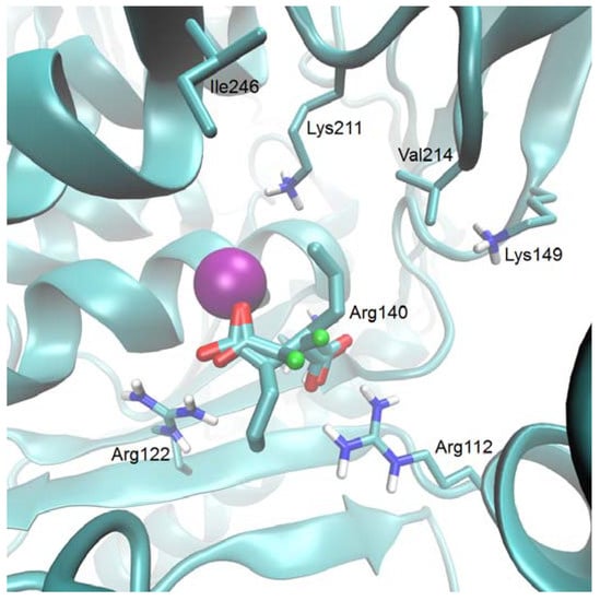 The C1 carboxylate of the inhibitor is bound to the active site magnesium ion, while the C7 carboxylate is bound by the receptor’s Arg112 and Arg140 guanidine moieties. The divalent cations Arg112 and Arg140 were previously identified as those involved in binding of the respective carboxylate functions of the homoisocitrate substrate [13,14]. On the other hand, in the most probable orientation, the allyl substituent at C3 of 7c points toward the small, partially hydrophobic pocket formed by the Val214, Ile246 residues and the nonpolar part of the Lys211 side chain. This pocket is supposed to be the binding site of the NADH substrate [13]. The hydrophobic character of the niche accommodating the C3 substituent explains the slightly higher inhibitory potential of 7c (the allyl derivative) in comparison to 10, bearing the carboxylate function. It should be noted therefore, that the third carboxylate function of (2R,3S)-homoisocitrate docked at the active site of C. albicans HIcDH is bound by the ε-amino group of Lys149 [14], so that one may assume that binding of 7c should be weaker than that of the substrate, due to the substitution of relatively strong electrostatic interactions between carboxylate of the substrate and Lys149 by the much weaker hydrophobic effect. Nevertheless, binding of 7c and 10 at the active site at the orientation partially overlapping that of the homoisocitrate substrate, seems the most plausible reason of its weak CaHIcDH inhibitory properties.
