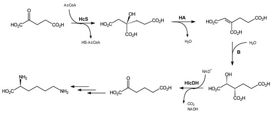 Details of the three initial reactions of AAP. HcS—homocitrate synthase; HA—homoaconitase; HIcDH—homoisocitrate dehydrogenase.