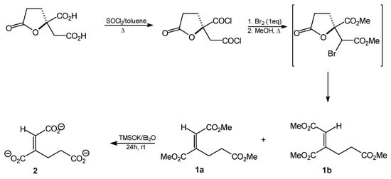 Two stereoisomers of homoaconitate were synthesized from (R)-homocitric lactone following the strategy shown in Scheme 2. The lactone was first converted into the respective dichloride. This compound was then brominated at the α-methylene position. Heating in methanol promoted the conversion of the acid chlorides into methyl esters, ring opening and HBr elimination. In this way, a mixture of cis and trans isomers of homoaconitate (molar ratio 3:1) was obtained with the overall yield of 37%. The stereoisomers could be effectively separated by flash chromatography. Both were easily, almost quantitatively converted into respective tripotassium salts upon treatment with potassium trimethylsilanolate.