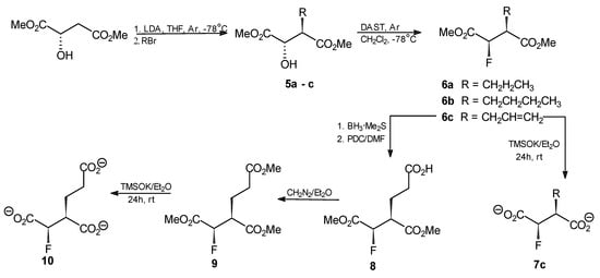 Dimethyl (S)-malate was first alkylated with an appropriate alkyl/allyl bromide. This reaction was highly stereoselective, as expected for a Seebach-type alkylation [8] and resulted in formation of single diastereoisomers of compounds 5a–c. The stereochemistry of these compounds was assigned as (2S,3R), based on the known stereospecificity of the Seebach alkylation of (S)-malate [8,9]. With dimethyl (R)-malate as a substrate, (2R,3S) stereoisomers were formed as the only products (data not shown). Treatment of compounds 5a–c with DAST afforded single diastereoisomers of the succinate derivatives 6a–c. This reaction, as a nucleophilic substitution of the SN2 type [10], lead to the inversion of configuration at the hydroxyl-substituted C2 atom. Obviously, there was no inversion of the actual absolute configuration at C3 in this reaction but its stereochemical notation changed, due to the introduction of fluorine at C2. Thus the (2R,3S) configuration could be assigned to compounds 6a–c. Compound 6c was converted into dimethyl (2R,3S)-2-fluoro-2-deoxyhomoisocitrate in a two-step reaction. The trimethyl ester 9 was obtained upon treatment of dimethyl (2R,3S)-2-fluoro-2-deoxyhomoisocitrate 8 with an ethereal solution of diazomethane and could be converted into the respective tripotassium salt 10. All the compounds 1–10 were fully characterized using their spectroscopic data.