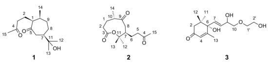- Weiss, G.; Koreeda, M.; Nakanishi, K. Stereochemistry of theaspirone and the blumenols. J. Chem. Soc. Chem. Commun. 1973, 565–566. [Google Scholar] [CrossRef]