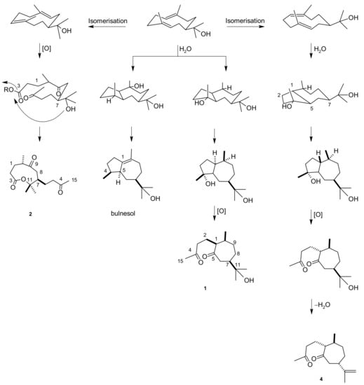Proposed biogenetic pathway for sesquiterpenes 1, 2, and 4.