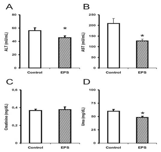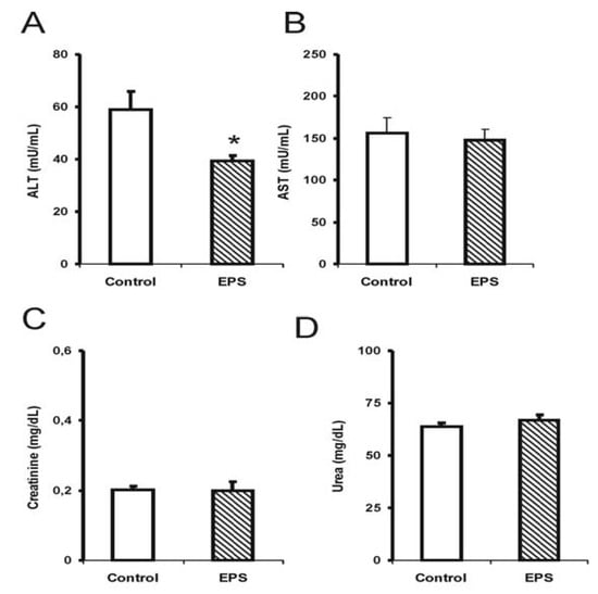 In the present study, toxicity arising from biochemical, immunological and histopathological variables resulting from treatment with EPS in both sexes were not identified. However, differences in terms of responses in biochemical parameters were observed, where the males showed reduction in the activity of liver enzymes and blood glucose values when compared with females. Therefore, the differences in the pulse of growth hormone [22] and even in the gastrointestinal absorption rate of EPS, when comparing males and females, indicates a pathway that explain these results, given that the exact mechanism of gastrointestinal absorption of EPS and the subsequent hormonal responses still remain to be elucidated.