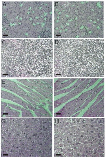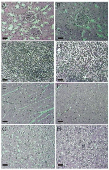 Histological tissue sections from female mice (100×). (A) kidney from the control group; (B) kidney from the lasiodiplodan-treated group; (C) spleen from the control group; (D) spleen from the lasiodiplodan-treated group; (E) heart from the control group; (F) heart from the lasiodiplodan-treated group; (G) hepatic tissue from the control group; and (H) hepatic tissue from the lasiodiplodan-treated group. Scale bar 25 micron.