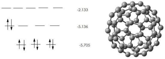 The problem concerning the stability of these conformations derives from the Ih structure. It is likely that Ih is the more symmetric species, almost all the lower symmetries are subgroups of the Ih point group (with the exception of D5h) [21,22,23,24]. Identifying an isomer from the same symmetry point group as the classical C60 fullerene suggests that this will represent the most stable conformation; however this is not the case, actually the C80 experiments a Jahn-Teller distortion and as a result arise species with lower energy and less symmetry [1,24]. An analysis of the frontier molecular orbitals makes it possible to follow this distortion in all cases. In all the molecular orbital diagrams displayed, the energy values are presented in units of eV. It is also important to indicate that this analysis, as well as the one corresponding to the endohedral complexes only takes into account six isomers. The results obtained for both C2v structures are very similar, so that only one of these was included in the study.