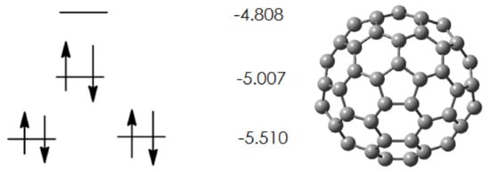 Some examples of molecular orbital diagrams of the endohedral complexes are presented in Figure 8, the arrangement in the case of the Ih isomer has been little adapted because the actual situation is those suggested by Nagase and his coworkers [26] in which the point group after the lanthanum doped is D2h and HOMO set is formed by four non-degenerated single MO’s with ag, b1g, b2g and b3g, however the energy differences among the four orbitals suggest again a kind of accidental degeneracy in two sets, the triple degenerated set of the D5h species come from a similar situation because the definitive point group after the lanthanum doped is C2 and this point group obviously has not triple degenerates sets.