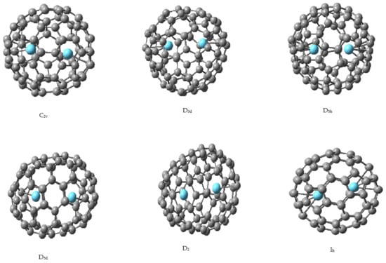 The six endohedral complexes coming from the interaction of two lanthanum ions and each one of the isomer cages of C80 are shown in Figure 6.