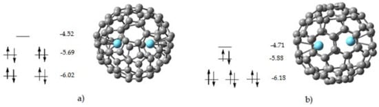 Molecular orbital diagrams for the most symmetric isomers of the endohedral complex (a). Ih; (b). D5h.