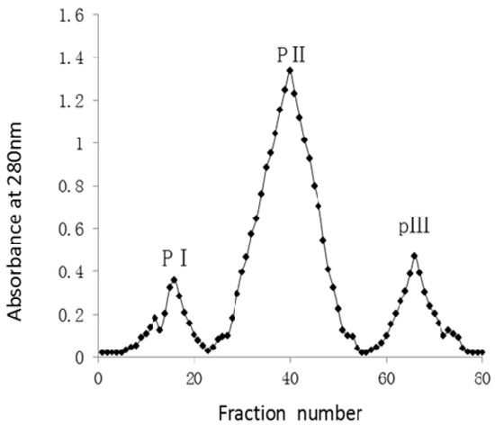 Ginkgo biloba seeds were homogenized in 0.14 mol/L NaCl solution dissolved in 0.02 mol/L citrate phosphate buffer, the homogenate was filtered through filter paper and the filtrate was centrifuged, then ammonium sulphate was added to the supernatant to 70% saturation to precipitate proteins. The saline solution extract of Ginkgo biloba seeds, showed 51% antioxidant activity by a DPPH radical scavenging assay, and the crude proteins obtained by ammonium sulphate precipitaton showed 61% antioxidant activity. Then the crude proteins dissolved in 0.02 mol/L citrate phosphate buffer were passed through a 3,000 MW polysulfone membrane to remove ammonium salts and other low molecular weight components such as free sugars or polyphenols, which could contribute to the antioxidant activity, and the filtered protein solution was further applied onto a DEAE-Cellulose 52 column. Then the purified total proteins were applied onto a Sephadex G-50 column and eluted with 0.02 mol/L citrate phosphate buffer. Fractionation of the protein resulted in three peaks (PI, PII and PIII) as monitored at 280 nm (Figure 1).
