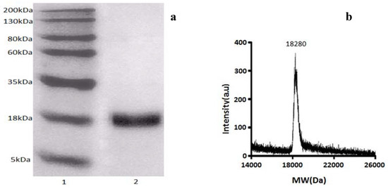 The results of SDS-PAGE electrophoresis of GBSP are shown in Figure 2a. The GBSP showed only one band with an approximate molecular weight of 18 kDa. Through further MALDI/MS analysis, it was shown that GBSP was a protein with exact molecular mass of 18.28 kDa (Figure 2b). The protein purity was further confirmed by reverse phase HPLC that showed single peak (Figure 2c). Thus the above results can indicate homogeneity of the purified protein (GBSP).