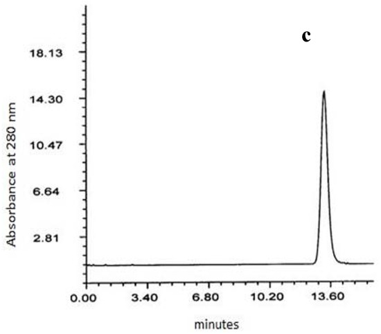 (a) SDS-PAGE of purified antioxidant protein from Ginkgo biloba seeds. Lane 1, Molecular weight marker; Lane 2, the purified antioxidant protein (GBSP); (b) chromatogram of purified protein (GBSP) by MALDI/MS analysis; (c) HPLC chromatogram of purified protein (GBSP).