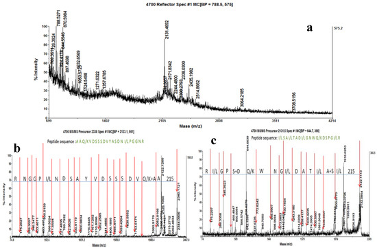 Peptide mass fingerprinting (PMF) and amino acid sequence of GBSP. (a) The MALDI-TOF spectrum of GBSP; (b) the amino acid sequence of the 2131 Da peptide; (c) the amino acid sequence of the 2338 Da peptide.