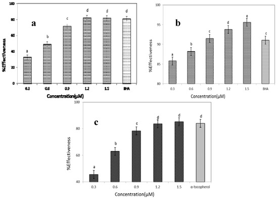 Free radical scavenging activity. (a) DPPH radical scavenging activity of GBSP (0.3–1.5 μM) and BHA (400 μM), a–d means having same superscript are not different (p > 0.05); (b) ABTS radical scavenging activity of GBSP (0.3–1.5 μM) and BHA (400 μM), a–e means having same superscript are not different (p > 0.05); (c) Superoxide anion radical scavenging activity of GBSP (0.3–1.5 μM) and α-tocopherol (400 μM), a–d means having same superscript are not different (p > 0.05). The results are shown as means ± SD (n = 3).