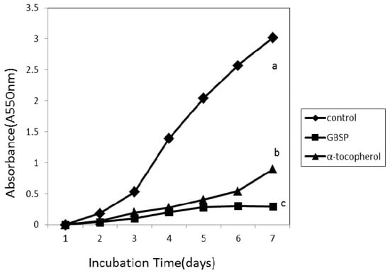 When free radicals attack membranes, which are high in lipids, they form lipid peroxides. Peroxidation of lipids is a complex process that involves formation and propagation of lipid radicals. Peroxidation can affect the nutritive value of foods and may cause disease [22]. The inhibitory effect of GBSP on lipid peroxidation was assessed with linoleic acid as lipid phase model system using iron-dependent system as a catalyst. As shown in Figure 5, the GBSP was compared with the natural antioxidant α-tocopherol for a period of seven days. The oxidation of linoleic acid was markedly inhibited by the addition of GBSP, and it was more effective when compared to α-tocopherol. The inhibitory activity of α-tocopherol decreased with time, while GBSP was more stable over time. The inhibitory ratio of GBSP was 90.39% at the seven day, which was higher than that of α-tocopherol (70.53%).
