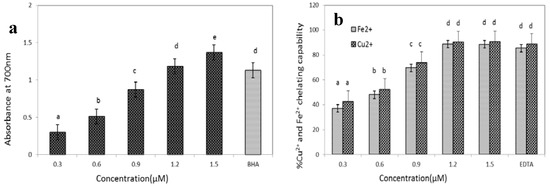 (a) Reducing power of GBSP (0.3–1.5 μM) and BHA (400 μM), a–e means having same superscript are not different (p > 0.05); (b) Cu2+ and Fe2+ chelating activity of GBSP (0.3–1.5 μM) and EDTA (60 μM), a–d means having same superscript are not different (p > 0.05). The results are shown as means ± SD (n = 3).