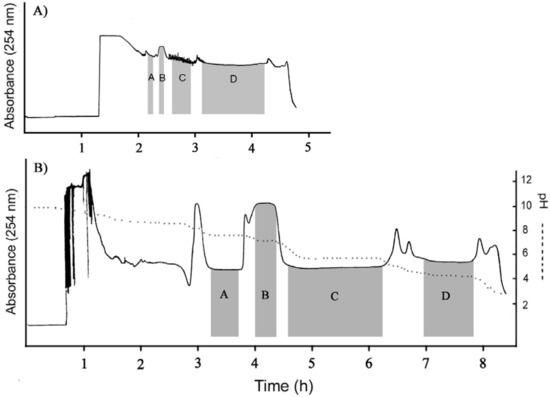 According to the rule of the selection of the solvent system, by reducing the ratio of methanol and increasing the ratio of water of the biphasic solvent system, the resolution of the target alkaloids and other impurities can be improved [11]. Thus, Pet–EtAc–MeOH–H2O (5:5:2:8, v/v) was selected for the efficient separation. After this two-phase solvent system was used for the CCC separation, it was found that this Pet–EtAc–MeOH–H2O (5:5:2:8, v/v) solvent system where triethylamine (10 mM) was added to the upper organic stationary phase and hydrochloric acid (5 mM) to the aqueous mobile phase was suitable for the large-scale separation of alkaloids. Figure 1B shows a typical chromatogram of pH-zone-refining CCC for the separation of 3.0 g of crude extract. The total separation time was about 8.5 h. Alkaloids were eluted as an irregular rectangular peak where four absorbance plateaus (plateaus A, B, C and D in Figure 1B) were observed. The measurement of pH values of the collected fractions also revealed four flat pH-zones, indicating the successful separation of four compounds. Considerable amounts of impurities were eluted in the front and back of the main peak, forming multiple peaks.