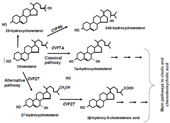 The 24-hydroxylase pathway in particular allows maintenance of cholesterol homeostasis in brain by conversion into 24S-hydroxycholesterol, also known as cerebrosterol. This reaction is catalyzed by the cholesterol 24-hydroxylase (CYP46) [28]. 24S-Hydroxycholesterol is more polar than cholesterol and it is able to pass the lipophilic membranes, such as the blood-brain barrier for transport through the circulation to the liver and further conversion to bile acids. Scheme 1 and Scheme 2 illustrate in a schematic way the main steps involved in the degradation of cholesterol to bile acids.