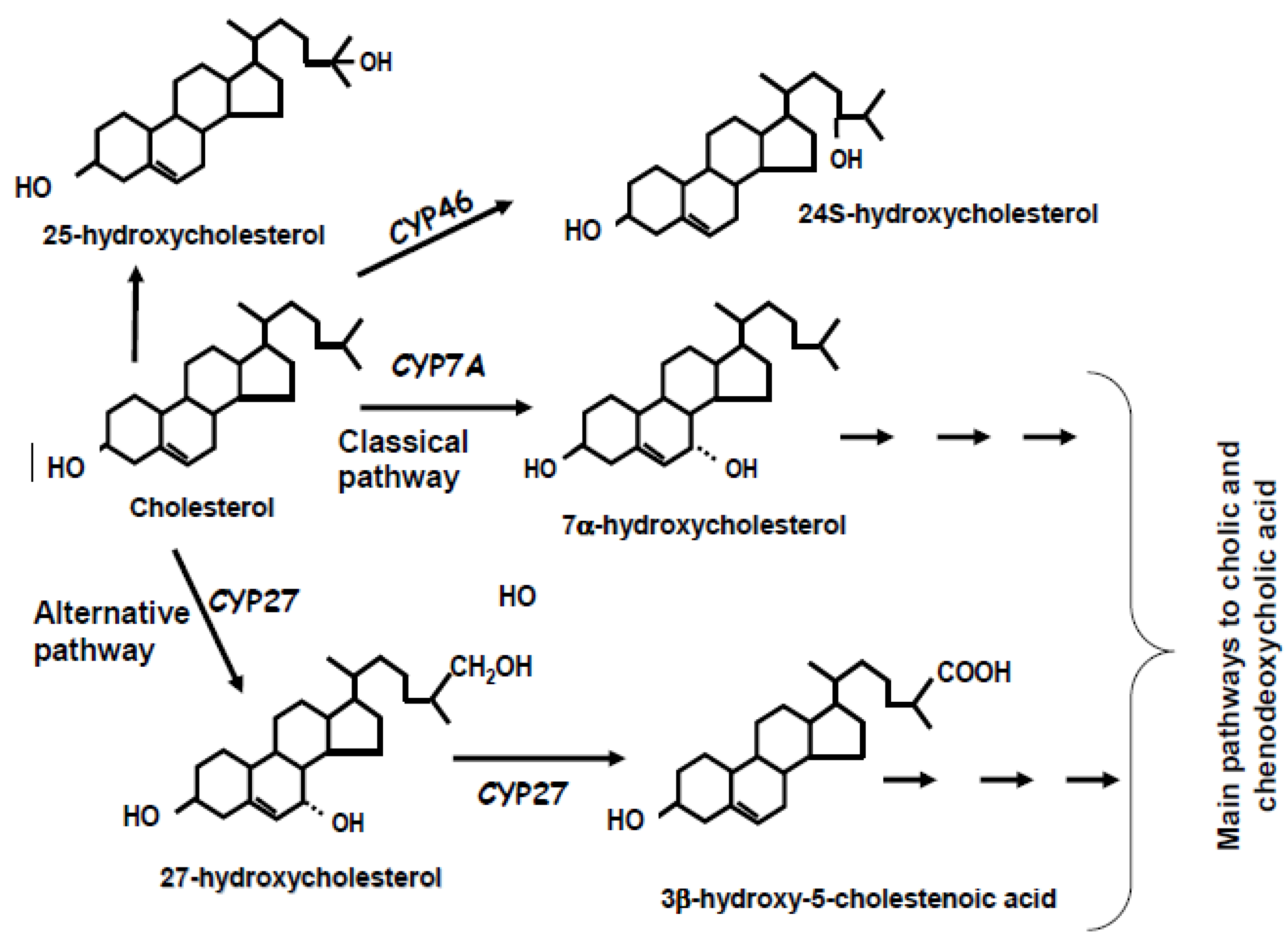 The role of the alternative biosynthetic pathway in quantitative terms is controversial: in human subjects, bile acid production via 27-hydroxylation accounts only for 10% of total bile acid synthesis [26]. Nevertheless the alternative pathway could represent an important means for removal of cholesterol deposited in endothelium and it is considered to be important in the reverse transport of cholesterol, from the periphery to the liver and its protective role against atherosclerosis has been proposed [27].